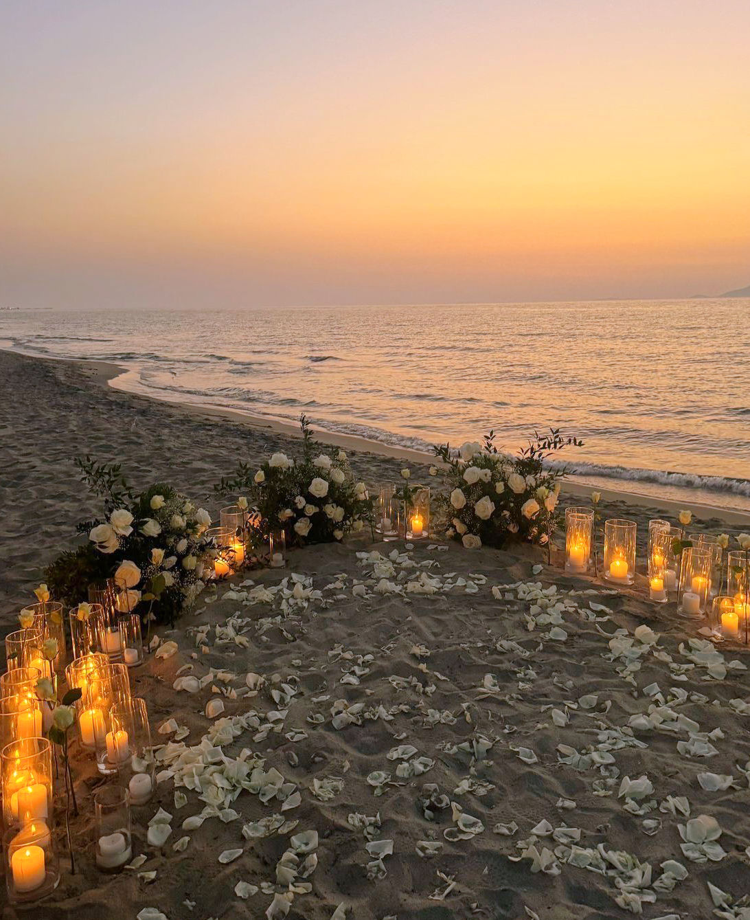 Scattered rose petals on the sand for a romantic touch +0$